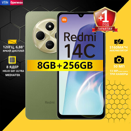 Смартфон Xiaomi Redmi 14C 8/256 ГБ Global представляет собой современное устройство, которое сочетает в себе высокую производительность, стильный дизайн и функциональность. Процессор MediaTek Helio G81 Ultra с частотой 2000 МГц и 8 ядрами обеспечивает быструю и плавную работу приложений. Объем встроенной памяти составляет 256 ГБ, а оперативной – 8 ГБ, что позволяет хранить большое количество данных и приложений. 6,88-дюймовый дисплей с разрешением 1640x720 и частотой обновления 120 Гц предлагает более кинематографичный и захватывающий вид вашего любимого контента. Смартфон поддерживает две nano SIM-карты и оснащен слотом для карты памяти. Беспроводные интерфейсы включают Wi-Fi, Bluetooth, GPS и USB Type-C. Основная камера смартфона имеет разрешение 50 МП и оснащена сверхширокоугольным объективом, режимом ночного видения и тройной камерой. Фронтальная камера имеет разрешение 13 МП. Комплектация включает смартфон, адаптер питания, инструкцию, инструмент для извлечения сим-карты и кабель USB (Type-C). Степень защиты IP68, IP52 и IP53. Емкость аккумулятора составляет 4500 мА⋅ч и выше. NFC отсутствует. Соотношение сторон экрана 18:9. Версия ОС на начало продаж – Android 14. Функции камеры: сверхширокоугольный объектив, режим ночного видения, широкоугольный объектив, тройная камера, двойная камера. Разрешение основной камеры составляет 50.0 МП. Характеристики основной камеры: широкоугольная, f/1.8, датчик глубины, 2 МП, f/2.4, вспомогательная линза, 0.08 МП. Максимальное разрешение видеосъемки составляет 1920x1080. Разрешение фронтальной камеры составляет 13.0 МП. Стандарт Wi-Fi 802.11 – 802.11ac. Версия Bluetooth – 5.4. Навигационные системы – ГЛОНАСС, BeiDou, Galileo, GPS. Особенности: барометр, гироскоп, датчик света, датчик движения, сканер отпечатка пальца, датчик распознавания лица, слот для карт памяти, встроенный микрофон, GPS-трекер. Разъем для наушников – mini jack 3.5 mm. Вес – 211.0