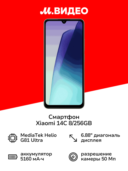 Смартфон Xiaomi Redmi 14C Sage Green - базовая модель, которая подойдет тем, кто хочет оставаться на связи и решать повседневные бытовые задачи. • IPS-экран диагональю 6,88 дюйма разрешением 1640x720 пикселей Отличается высокой яркостью (с функцией автонастройки) и точностью цветопередачи, комфортен для чтения, просмотра документов, фильмов, видеороликов. • Частота обновления до 120 Гц Обеспечивает плавность прокрутки страниц и отображения любого другого контента. • Защита зрения Низкий уровень синего света, отсутствие мерцания помогают дольше смотреть на экран, не ощущая усталости глаз. • 256 Гб встроенной памяти Позволяет устанавливать приложения, игры, хранить различный контент. В основе смартфона - восьмиядерный процессор MediaTek Helio G81 Ultra и 8 Гб оперативной памяти. Тыловая камера одна: на 50 Мп, она способна снимать видео в качестве Full HD. Доступен трехкратный цифровой зум для приближения удаленных объектов и цифровая стабилизация для исключения помех и эффекта дрожания в сложных условиях съемки. Для общения по видеосвязи и селфи предусмотрена фронтальная камера на 13 Мп с функцией автофокусировки и ночным режимом. Встроены фильтры, которые можно использовать не только со статичными изображениями, но и с видео. Доступ владельца производится на основе распознавания лица или отпечатка пальца, сканер размещен на боковой грани. Аккумулятор емкостью 5160 мА*ч поддерживает быструю зарядку, мощность блока питания - 18 Вт. Интегрирован порт USB Type-C, также установлен разъем 3,5 мм для проводных наушников. Корпус выполнен из пластика и обладает толщиной всего 8,22 мм, благодаря чему удобно лежит в ладони.