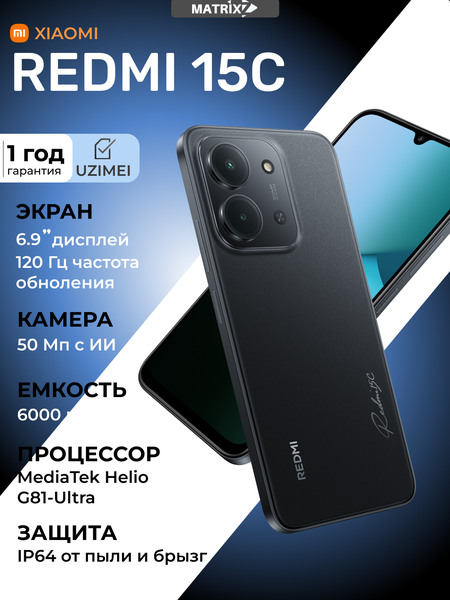 Xiaomi Redmi 15C — обзор ✨ Дизайн и экран 6,9-дюймовый IPS-экран с частотой обновления 120 Гц Каплевидный вырез под камеру, тонкие рамки сверху и по бокам Пластиковый корпус, цвета: чёрный, синий, зелёный, оранжевый Производительность Процессор MediaTek Helio G81 Ultra, 8 ядер 4 ГБ ОЗУ, 128 или 256 ГБ встроенной памяти, поддержка microSD до 1 ТБ Достаточно мощности для повседневных задач и лёгкого гейминга Камеры Основная камера 50 МП с автофокусом + дополнительный модуль (глубина или макро) Фронтальная камера 8 МП Батарея Ёмкость 6000 мАч Быстрая зарядка 33 Вт, до 77 часов автономности Связь и возможности Dual SIM, 4G LTE Wi-Fi 5, Bluetooth 5.3–5.4, NFC (в зависимости от региона) USB-C, 3.5 мм аудиоразъём, FM-радио, ИК-порт Защита от брызг и пыли IP64 Сканер отпечатка сбоку и распознавание лица HyperOS 2.0 на базе Android 15 «Ваш IMEI зарегистрируется сам автоматически в течение 30 дней.»