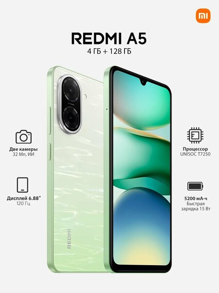 Смартфон Xiaomi Redmi A5 "Lake Green" предлагает стильный и функциональный дизайн для современных пользователей. корпус из металла и пластика придает устройству современный и элегантный вид. 6.88-дюймовый IPS-дисплей с разрешением 1640x720 пикселей обеспечивает отличное качество изображения и комфортное использование. Частота обновления экрана 120 Гц обеспечивает плавность и быстродействие при просмотре видео и игр. Смартфон работает на базе операционной системы Android 15 Go, что предлагает удобный и интуитивно понятный интерфейс. 4 ГБ оперативной памяти и 128 ГБ встроенной памяти позволяют хранить большое количество данных и приложений. 32-мегапиксельная камера с двойной светодиодной вспышкой и автофокусом позволяет делать качественные и яркие фотографии. Емкий аккумулятор на 5200 мАч обеспечивает длительное время работы без подзарядки, а функция быстрой зарядки позволяет быстро зарядить устройство. Беспроводные интерфейсы Bluetooth 5.2 и Wi-Fi 802.11ac обеспечивают стабильное подключение к интернету и другим устройствам. Сканер отпечатка пальца и GPS-навигация обеспечивают надежную аутентификацию и точное определение местоположения. Выбирайте смартфон Xiaomi Redmi A5 "Lake Green" для комфортного и продуктивного использования!