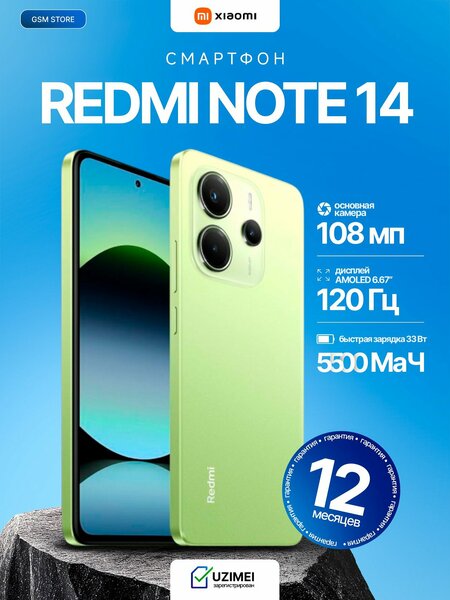 Redmi Note 14 — стиль, мощь и надёжность в одном смартфоне Redmi Note 14 сочетает в себе современные технологии и премиальный дизайн. Большой 6.67" AMOLED FHD+ дисплей с частотой 120 Гц и яркостью до 1800 нит подарит ультра-чёткое изображение даже на солнце. Мощный 8-ядерный MediaTek Helio G99 Ultra (до 2.20 ГГц) обеспечивает плавную работу игр и приложений без задержек. Камера 108 Мп с искусственным интеллектом делает детализированные и яркие снимки днём и ночью. Большая батарея на 5500 мАч и быстрая зарядка 33 Вт позволяют пользоваться смартфоном до двух дней без подзарядки. Экран надёжно защищён прочным стеклом Corning Gorilla Glass 5. Для удобства и безопасности предусмотрены подэкранный сканер отпечатков и AI Face Unlock. Смартфон имеет защиту IP54 от пыли и брызг, а также оснащён всеми необходимыми интерфейсами: USB Type-C, 3.5 мм разъём для наушников, ИК-порт. Официальная гарантия 1 год. Все IMEI зарегистрированы в Узбекистане, активация занимает до 30 дней.