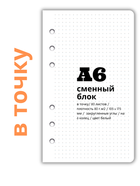 Сменный блок А6 для ежедневников на 6 кольцах. 80 листов в точку.