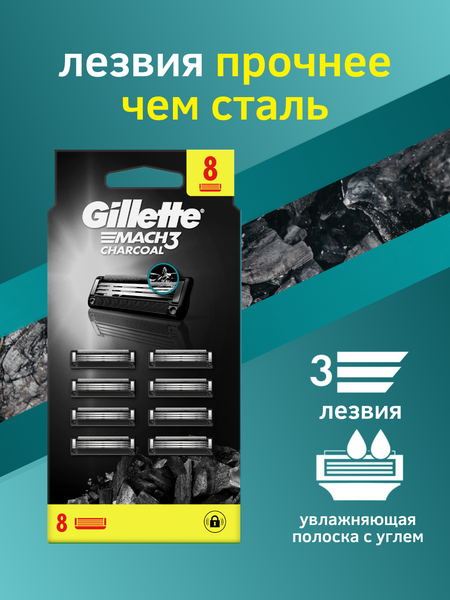Кассеты Gillette Mach3 Уголь с 3 лезвиями прочнее стали и инновационной увлажняющей полоской с углём, обеспечивает комфортное скольжение и чистое бритьё. • Улучшенная смазывающая полоска для более комфортного скольжения содержит в составе уголь, обеспечивая свежесть и чистоту кожи после каждого бритья • Лезвия из высококачественной нержавеющей стали, усиленные атомарным углеродным покрытием, дольше сохраняют остроту для чистого бритья без порезов • К мужской бритве Mach3 Уголь подходят все сменные кассеты Mach3 и Mach3 Turbo