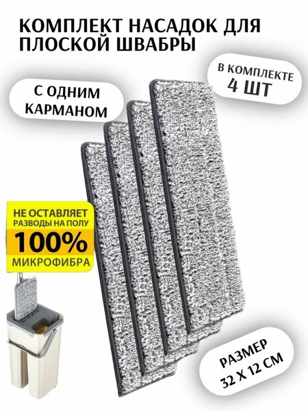 Сменные насадки из микрофибры для плоской швабры, 4 штуки, с одним карманом - держателем (комплект 4 шт)