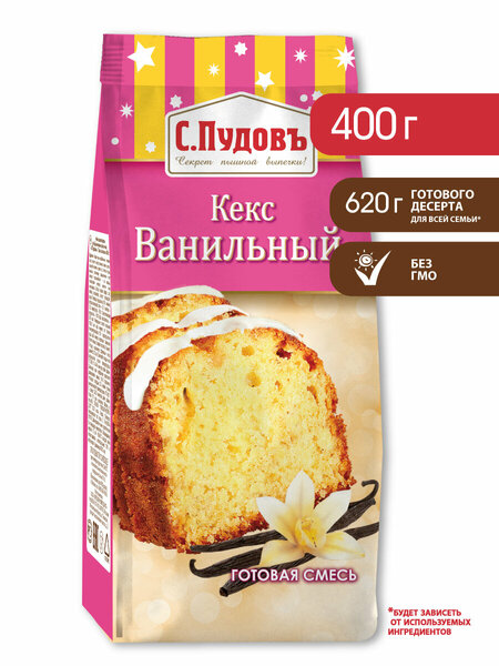 С готовой смесью для выпечки «Кекс ванильный» от «С. Пудовъ» вы сможете легко и просто приготовить ароматный и вкусный десерт. Ванильный кекс – классика домашней выпечки, которую одинаково любят и взрослые, и дети. Готовить его можно хоть каждый день. С готовой смесью для выпечки «С. Пудовъ» вам не нужно думать о технологии приготовления правильного теста – об этом мы уже позаботились. Всё, что вам понадобится для выпечки – вода, яйцо и масло. Даже если у вас нет кулинарного опыта, этот кекс получится превосходным, можно не сомневаться. Со способом его приготовления сможет справиться даже ребёнок. Готовый кекс получается влажным, рассыпчатым с хрустящей корочкой и тонким ароматом ванили. То, что нужно к чаепитию или чашечке свежезаваренного кофе – просто идеальная пара! Состав: мука пшеничная хлебопекарная высшего сорта, сахар белый, крахмал кукурузный, ваниль натуральная измельченная, пищевая морская соль, разрыхлители теста (годрокарбонат натрия - сода пищевая, пирофосфат натрия), эмульгаторы (моно- и диглицериды жирных кислот), Может содержать следы сои, молока, орехов, арахиса, кунжута, сельдерея, горчицы. Пищевая ценность в 100 г готового продукта: белки: 6,5 г жиры: 2,5 г углеводы: 78,0 г Энергетическая ценность: 1510 кДж, калорийность: 360 ккал. Срок годности: 12 месяцев. Хранить при температуре +20±5С и относительной влажности воздуха не более 75%.
