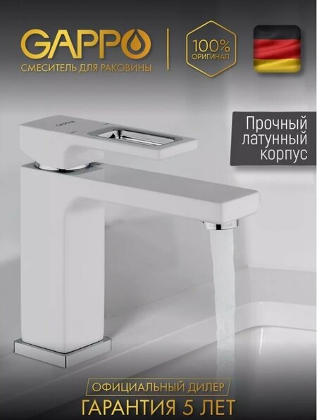 Смеситель GAPPO Гаппо G1017 белый с хромом для раковины для ванны для умывальника кухни. Смеситель торговой марки GAPPO широко известны своей надежностью. Предлагаемый однорычажный смеситель для раковины GAPPO (гаппо) G1017-6 серии FUTURA изготовлен из латуни с последующим окрашиванием в белый, черный. Корпус монолитный, неповоротный. Металлическая рукоятка. Керамический испанский картридж Ф35 мм. В комплекте гибкая подводка (500 мм) на 1/2 дюйма, инструкция, гарантийный талон. Кран для мойки квадратный для умывальника, для раковины, для ванной, для душа, для дачи, на кухню, сантехника в ванную комнату. Общие характеристики Гарантийный срок 1 год Модель G1017 Технические особенности Материал изделия латунь