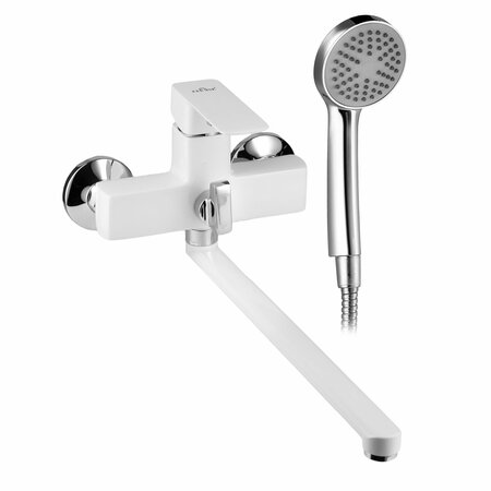 Смеситель для ванной длинный излив 35 см с душевым набором, белый с хромированным дивертором