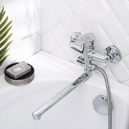 Однорычажный настенный смеситель для ванны с длинным изливом с дивертором это не только стильный акцент вашего интерьера, но и удобство в использовании на долгие годы. При производстве смесителей ТМ РМС используются только высококачественные материалы. Все модели проходят процесс гальванизации, что придает им большую износостойкость и улучшает антикоррозийные свойства. Хромированная поверхность не потеряет со временем свой изначальный вид, а уход за ней сводится к протиранию мягкой салфеткой. Установка смесителя крайне проста. Смесители РМС это сертифицированный продукт с 5-летней гарантией. В комплекте удобная лейка с гибким шлангом, настенный держатель, эксцентрики и отражатели. Смеситель для ванны с длинным изливом Картридж: керамический 35мм Переключение на душ: евро-дивертор Поворотный прямой излив Аэратор: пластиковый Покрытие: хром В комплекте: эксцентрики, отражатели, металлический шланг для душ 1,5м, лейка для душа Торговая марка: РМС