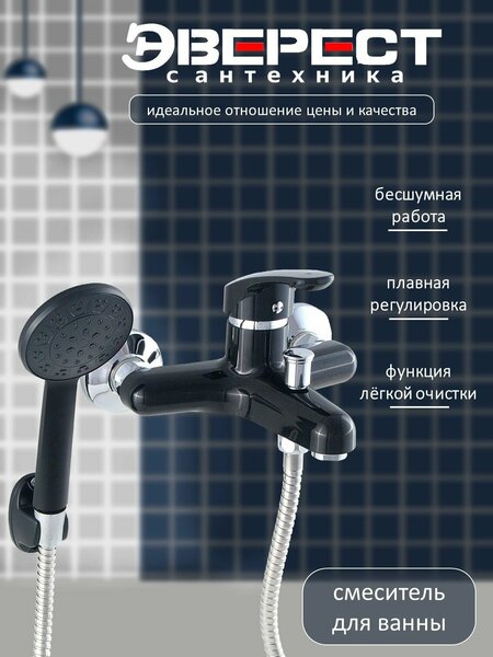 Смеситель для ванны с душем Эверест B30-0336 с коротким монолитным изливом, кран в ванную, черный