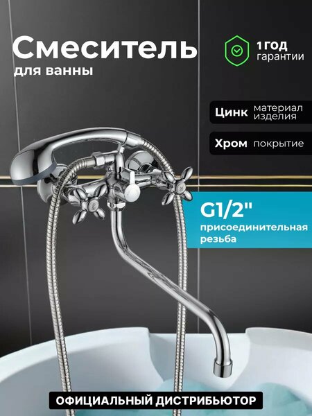 Смеситель для ванны с душем с длинным поворотным изливом NNF-0024 вентильный кран в ванную, для раковины цвет: хром