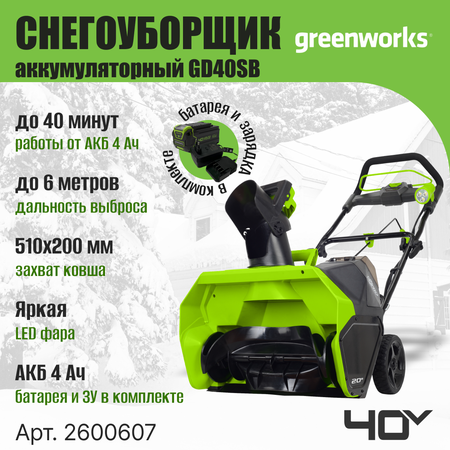 Снегоуборщик аккумуляторный Greenworks 2600607, снегоочиститель 40V, 51 см, с 1хАКБ 4 Ач и ЗУ