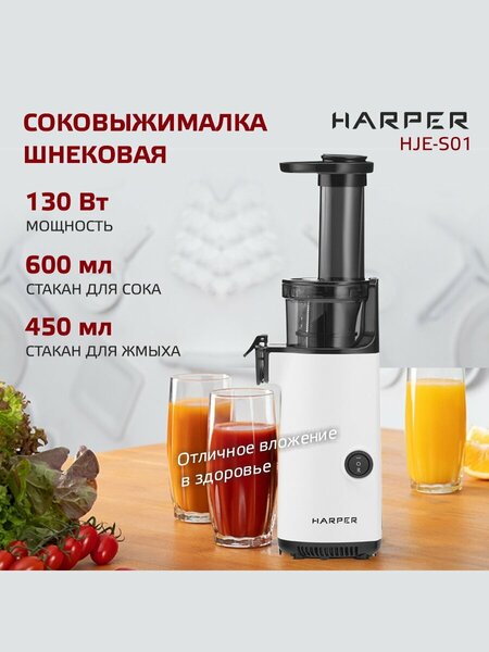 Ищете идеальный полезный подарок женщине? Соковыжималка для овощей и фруктов вполне подойдет! Если вы заботитесь о здоровье и любите натуральные свежевыжатые соки, соковыжималка шнековая электрическая Harper HJE-S01 станет незаменимым помощником на кухне. Шнековая соковыжималка имеет эргономичное вертикальное исполнение и не занимает много места при хранении или работе. Низкие обороты вращения шнека обеспечивают наиболее правильный отжим ягод, фруктов, овощей или зелени, сохраняются все витамины и питательные вещества. Чтобы отжать всё до последней капли – воспользуйтесь реверсом. Механизм отжима прост в сборке и практичен в уходе. важно: перед тем, как соковыжималка шнековая электрическая Harper HJE-S01 будет включена в сеть, убедитесь, что верно собрали все части устройства (см. инструкцию и фото в карточке товара). Паз на горловине необходимо повернуть по часовой стрелке до щелчка. В данной модели установлена защита двигателя, он не включится при неправильной сборке устройства!