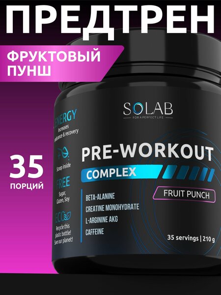 Получите взрывной заряд энергии и подготовьте организм к высокой физической нагрузке в спортзале. Порция энергетического коктейля от Solab со вкусом фруктового пунша перед тренировкой позволит разбудить силовые ресурсы организма, повысит выносливость и мотивацию. Вы сможете существенно продлить время активных занятий, что положительно повлияет на спортивные результаты. Предтренировочный комплекс имеет сбалансированный и безопасный для организма состав. Спортивное питание естественным образом стимулирует энергоресурсы организма, защищая при этом сердечно-сосудистую систему от перегрузок. Таурин нормализует метаболические процессы в сердечной мышце, улучшает кровообращение, нормализует сердечный ритм и артериальное давление. Кофеин придает бодрости и запускает процесс эффективного жиросжигания. Креатин моногидрат принимают для увеличения мышечной массы, так как он повышает кратковременную анаэробную выносливость и позволяет делать больше подходов при выполнении упражнений. BCAA 2:1:1 нормализует аминокислотный баланс, регулирует обмен веществ в тканях, защищает от катаболизма. Бета-аланин снижает нейромышечную усталость, увеличивает выносливость и снижает выделение лактата. L-цитруллина DL-малат стимулирует прилив кислорода и крови к мышцам, увеличивая производительность тренировок. L-аргинин активизирует процесс сжигания жировой прослойки и способствует наращиванию мышечной массы. Прием спортпита способствует быстрому восстановлению мышц. За счет снижения уровня молочной кислоты болевые ощущения будут тревожить намного меньше. Спортивная добавка соответствует международным стандартам качества. Не содержит сахар, ГМО, сои. В упаковке 35 порций. Принимайте предтренировочный комплекс за 15-30 минут до тренировки. Для приготовления напитка смешайте 1 мерную ложку сухой смеси с 200-250 мл воды или сока. Для удобства используйте шейкер.