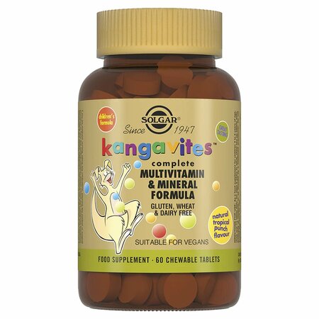 Уважаемый покупатель! На каждом товаре есть индивидуальная маркировка (QR-код), что подтверждает регистрацию в "Честном знаке". Сканирование qr-кода необходимо осуществлять через приложение "Честный знак". Компания Solgar постепенно удаляет вату из упаковок своих продуктов, с учетом рекомендаций Национального института здравоохранения, не вкладывать ватные шарики в упаковку таблеток и капсул, т. к. они могут абсорбировать влагу и привести к слипанию содержимого. "Кангавитес. Комплексная формула мультивитаминов и минералов со вкусом тропических фруктов" — мультивитамины для детей в жевательных таблетках, богатые витамином С, фолиевой кислотой, биотином, кальцием, магнием. Также комплекс мультивитаминов и минералов Кангавитес от Солгар содержит селен, хром и соевый лецитин. Стимулируя функции роста и развития, данный продукт снабжает организм веществами, необходимыми для развития и поддержки тканей и систем организма, содействует нормальному функционированию нервной и мышечной системы, а также улучшению памяти и мозговых функций. "Кангавитес. Комплексная формула мультивитаминов и минералов со вкусом тропических фруктов" выпускается в форме жевательных таблеток, подслащенных фруктозой и ароматизированных натуральными экстрактами тропических фруктов и овощей. Также данный комплекс содержащих биофлавоноиды цитрусовых, экстракты брокколи, красной свеклы, моркови, абрикосов, яблок, клубники и шиповника и удовлетворяет суточную потребность развивающегося организма в витаминах и минералах. Фармакологическое действие: Витамины и минералы особенно важны для детского и подросткового организма, что связано с интенсивным ростом детей и особенностями обменных процессов. Недостаточное потребление микронутриентов снижает активность иммунной системы, повышает частоту респираторных и желудочно-кишечных заболеваний, существенно ухудшает успеваемость в школе.