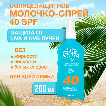 Солнцезащитное молочко - спрей бренда Dr. Safe с высокой степенью защиты помогает адаптироваться коже к принятию солнечных ванн, увеличивая время безопасного пребывания под солнцем. Оно специально разработано для защиты вашей кожи от вредного воздействия солнечных лучей. Крем 200 мл с SPF ( спф, sunprof ) 40 спасет кожу лица и тела от преждевременного старения, предотвращая появление морщин. Увлажняющее и восстанавливающее средство с приятным запахом содержит витамин Е для питательного ухода за кожей, обеспечивая успокаивающий эффект после загара. Также в составе уходовой косметики есть масла ши и кокоса, которые способствуют восстановлению и регенерации кожи. А эффективный фильтр поглощает до 98% UVA- и UVB-лучей, защищая кожу от покраснений, борясь против раздражений и солнечных ожогов. Молочко обладает солнцеотталкивающими свойствами, не выбеливает кожу, имеет самую эффективную антиоксидантную защиту. Это популярное и универсальное косметическое молоко подходит для любого типа кожи: нормальной, чувствительной, жирной, сухой и очень проблемной. Оно эффективно предотвращает сухость, шелушения и раздражения после длительного нахождения на солнце или воде. Благодаря формуле с кокосовым маслом, оно заботится о красоте вашей кожи, сохраняет ее молодость и препятствует разрушению клеток. Для ежедневного ухода перед нанесением макияжа или после душа этот спрей станет вашим идеальным помощником в борьбе с солнечными лучами. Безопасный состав обеспечивает базовую солнцезащиту, делая ваш загар красивым и равномерным. Насладитесь каждым днем под солнышком, зная, что ваша кожа надежно защищена.