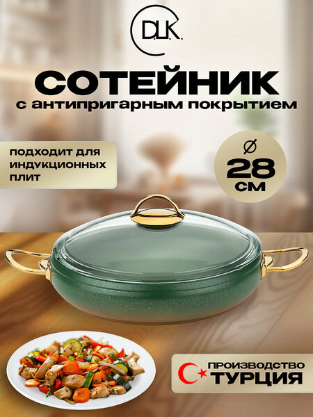 Сотейник с крышкой алюминиевый 28х6,5 см (3,5 л) D.L.K. - отличное решение для комфортного и эффективного приготовления пищи. Подходит для всех видов плит, включая индукционные. Кастрюля с антипригарным покрытием сочетает в себе множество полезных свойств, которые делают ее идеальной для использования на любой кухне. Сотейник для индукционной плиты изготовлен из алюминия, который обеспечивает равномерное распределение тепла и быстрый нагрев. Алюминий также известен своей легкостью и прочностью, что делает кастрюлю удобной в обращении и долговечной. Трехслойное антипригарное покрытие предотвращает прилипание пищи к стенкам кастрюли. Это не только упрощает процесс готовки, но и облегчает мытье после использования. Покрытие защищает кастрюлю от царапин и повреждений, что продлевает срок ее службы. Красивая посуда для кухни D. L. K. - отличный подарок для мамы, жены или бабушки на день рождения, 8 марта, Новый год или любой другой праздник. Сотейник с толстым дном подойдет для жарки, варки и тушения. Индукционное дно позволяет использовать кастрюлю на всех типах плит, включая газовые, электрические и керамические. Алюминиевая кастрюля комплектуется крышкой, которая помогает сохранить тепло и влагу внутри, что делает блюда более ароматными и вкусными. Стеклянная крышка позволяет наблюдать за процессом готовки. Эргономичные ручки обеспечивают безопасность и комфорт при использовании. Вы можете собрать целый набор кастрюль с крышками, так как в нашем ассортименте есть кастрюли разного объема и диаметра. Кастрюля для индукционной плиты станет надежным помощником на Вашей кухне, обеспечивая отличное качество приготовления и удобство в использовании. Производство - Турция.
