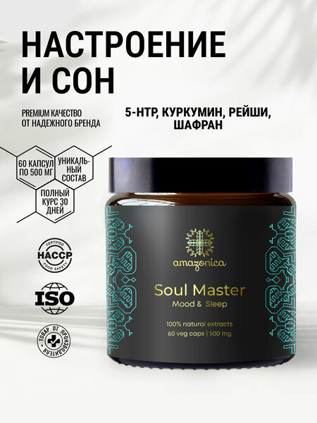 Soul Master — это комплекс из натуральных компонентов для эмоционального баланса и повышения настроения. Соул Мастер от Амазоники помогает справиться со стрессом, тревогой и раздражительностью, предотвращает эмоциональное выгорание, восстанавливает душевное равновесие и поддерживает естественный ритм сна. Компоненты добавки восстанавливают гормональный баланс - контролируют уровень кортизола и помогают поддерживать уровень серотонина на высоком уровне, что положительно сказывается на настроении и мотивации. • Гриффония — натуральный антидепрессант. Содержит 98% 5-НТР - предшественника серотонина. Помогает снизить тревожность и напряжение, улучшает сон и поддерживает позитивный настрой • Шафран — природное средство для повышения уровня серотонина с доказанной эффективностью. Снимает нервное напряжение, защищает клетки от окислительного стресса • Рейши — гриб, балансирующий нервную систему, снижает раздражительность и помогает справляться со стрессом и бессонницей • Куркумин — Снижает симптомы депрессии и оказывает противотревожное действие. Нормализует выработку ключевых нейромедиаторов: дофамина, норадреналина, серотонина • Черный перец — усиливает усваиваемость куркумина до 20 раз. Способствует укреплению общего здоровья Био активные добавки Amazonica производятся с использованием только премиальных экстрактов, проверенных на чистоту и эффективность. Продукт не содержит синтетических добавок и проходит тщательный контроль качества