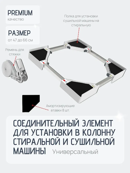 Универсальный крепёжный соединительный элемент для стиральных и сушильных машин, С помощью этого элемента стиральную и сушильную машины можно установить друг на друга, чтобы сэкономить место в помещении. Самосборный, поставляется, в разобранном виде. Монтажный комплект для стиральной и сушильной машины совместим с любыми моделями, глубиной от 42 до 66 см и шириной 60 сантиметров. Обратите пожалуйста внимание разница по глубине между стиральной и сушильной машиной не должна быть более 15 см. -Стиральная машина глубино 47 см сушильная 58 см -> можно ставить -Стиральная машина глубино 42 см сушильная 58 см -> не подойдёт Возможно применение для установки мебели или шкафов друг на друга. Комплект для штабелирования изготовлен из высококачественного прочного пластика и нержавеющей стали. Трос с храповым механизмом сделан из высококачественного полиэстера, он прочный и не ломается. Инструкция по установки по QR коду в каждой коробке