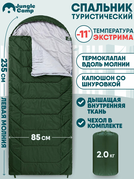Большой и комфортный спальник Jungle Camp Lugano Comfort предназначен для отдыха на природе с конца весны до начала осени, когда возможны похолодания. Прекрасно подойдет людям крупной комплекции и любителям простора и свободы во время сна. Два таких спальника можно состегнуть вместе, получив один двойной просторный теплый спальник. Большой капюшон анатомической формы со шнуровкой позволит быстрее согреться и с комфортом отдохнуть. Для хранения документов, телефона и других ценных вещей предусмотрен внутренний карман. Вдоль молнии расположен термоклапан для защиты от проникновения холода через молнию. Чтобы замок молнии не закусывал ткань спальника, вдоль молнии предусмотрена специальная лента, что повышает удобство использования спальника, особенно в темное время суток. особенности спальника: Возможность состегивания спальников между собой Капюшон анатомической формы Стягивающий шнур по капюшону Термоклапан вдоль молнии Защита от заедания молнии Внутренний карман Молния с левой стороны Чехол для удобного хранения и переноски Характеристики: Цвет: зеленый t° комфорт: 6°C t° лимит комфорта: 0°C t° экстрим: -11°C Внешний материал: 100% полиэстер Внутренний материал: Полиэстер Pongee Утеплитель: Hollowfiber 2х150 г/м2 Размер: 200 см х 85 см Размер в чехле: 26 см х 26 см х 48 см Вес: 2,0 кг Производитель: Россия