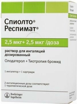 Рекомендуемая терапевтическая доза составляет две ингаляции спрея из ингалятора Респимат® (5 мкг/терапевтическая доза тиотропия бромида и 5 мкг/терапевтическая доза олодатерола) один раз в день, в одно и то же время суток (см. Инструкции по применению ). У пожилых пациентов можно использовать препарат Спиолто® Респимат® в рекомендуемой дозе. У пациентов с печеночной недостаточностью легкой и средней степени тяжести можно использовать Спиолто® Респимат® в рекомендуемой дозе. Данных о применении олодатерола у пациентов с печеночной недостаточностью тяжелой степени тяжести не имеется. У пациентов с нарушениями функции почек можно использовать препарат Спиолто® Респимат® в рекомендуемой дозе. Пациенты с почечной недостаточностью средней и тяжелой степени тяжести, применяющие препарат Спиолто® Респимат® , должны находиться под тщательным наблюдением врача. Инструкция по применению Перед началом использования препарата Спиолто® Респимат® необходимо прочитать эту инструкцию.