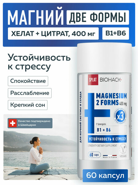 SPLAT BIOHACK+ Магний 400 мг элементарного магния в 2 органических активных формах: хелатный магния бисглицинат Albion™ и магния цитрат + синергисты: витамины B1, B6 для усиления эффектов магния. Поддерживает баланс нервной системы и сердечно-сосудистой систем, нормализует работу сердца и сосудов. Способствует снижению уровня стресса и тревожности, расслаблению мышц и улучшению качества сна в 3 раза лучше усваивается благодря запатентованному Albion™ магния бисглицинат в сравнении с оксидом магния. Хелатная форма магния бережно воздействует на желудочно-кишечный тракт. Клинически протестировано. Независимое усвоение двух форм магния, хелатного бисглицината и цитрата, обеспечивает более быструю доставку магния в клетку. Растительная капсула. Оболочка капсулы нрмс, не содержит диоксид титана, искусственные красители Вспомогательные компоненты: лецитин из подсолнечника, камедь акации гуммиарабик. Не содержат: диоксид кремния, стеарат магния, МКЦ