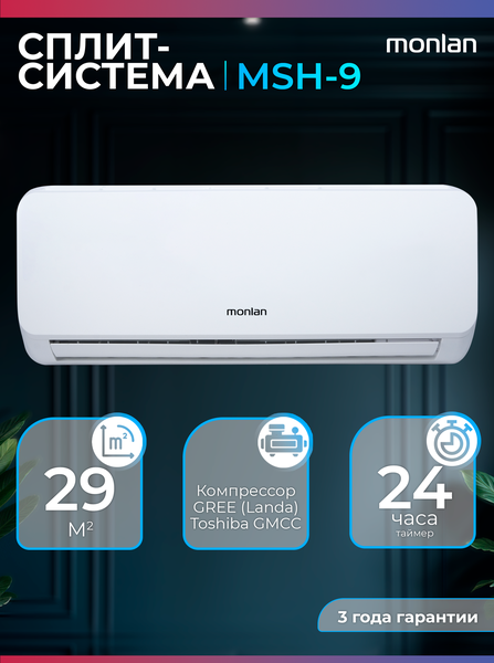 Кондиционер Monlan имеет режимы: Режим охлаждения «COOL» функция охлаждения позволяет кондиционеру снижать температуру в помещении и в то же время уменьшить влажность воздуха. Чтобы активировать функцию охлаждения (СOOL), нажимайте кнопку МОDЕ до тех пор, пока на дисплее ПДУ не отобразится соответствующий значок. Цикл охлаждения активируют при помощи кнопки «Вверх» или «Вниз», устанавливая температуру ниже, чем в помещении. Функция "TURBO"позволяет работать в интенсивном режиме, достигая максимальных температур в режиме охлаждения или обогрева. Функция «TIMER» При помощи кнопки TIMER на ПДУ вы можете настроить таймер на включение или выключение работы сплит-системы. При включении функции (SWING) (функция веерного распределения воздушного потока) заслонка движется вверх и вниз, напрявляя воздушный поток. Регулировка потока воздуха вправо и влево осуществляется при помощи вертикальных заслонок. Режим нагрева «HEAT» функция нагрева позволяет использовать cплит-систему для получения горячего воздуха. Чтобы активировать функцию нагрева (неат), нажимайте кнопку МОDЕ до тех пор, пока на дисплее ПДУ не отобразится соответствующий значок. При помощи кнопки «Вверх» или «Вниз», устанавливайте температуру выше той, что в помещении. Режим вентиляции «FAN» - с данной функцией кондиционер работает только в режиме вентиляции. Режим осушения «DRY» - функция уменьшает влажность воздуха, чтобы в помещении стало более комфортно. Режим SLEEP - в режиме сна температура увеличится по прошествии 1 часа в режиме охлаждения или сушки; температура снизится по прошествии 1 часа работы в режиме нагревания. Настройка температуры регулируется между значениями 16°С и 32°С. функция экстренного выключения - если пульт дистанционного управления затерялся или сели батарейки, вы можете использовать кнопку Аварийного запуска. Кроме того, кондиционер обладает функцией автоматического повторного запуска: он запоминает все ваши настройки — режим работы, температуру, поток воздуха — и при восстановлении электропитания возвращается к предыдущему состоянию без вашего вмешательства. А если в помещении никого нет, он перейдет в режим паузы для экономии электроэнергии — всё для вашего комфорта и безопасности. Кондиционер Monlan автоматически задерживает запуск минимум на 3 минуты после отключения, что помогает сохранить баланс давления системы и предотвратить возможные поломки. В режиме нагрева эта задержка увеличивается до 5 минут, обеспечивая стабильную работу. Выбирайте надежность и современные технологии — ваш комфорт всегда под контролем! Дисплей имеет индикаторы: индикатор нагрева, индикатор охлаждения, индикатор таймера, индикатор режима сна.
