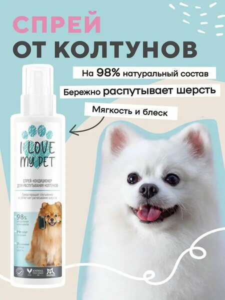 Ухаживающий спрей позволяет легко расчесывать шерсть без неприятных ощущений для питомца, помогает устранять колтуны и предотвращает их образование. Формула содержит комплекс аминокислот и пантенол, которые способствуют увлажнению и разглаживанию шерсти, придает шерсти здоровый блеск. Мягкий натуральный состав безопасен для кожи питомца. Обладает антистатическим эффектом. Не требует смывания. Для усиления эффекта рекомендуется использовать после шампуня и кондиционера. Подходит для щенков и котят.