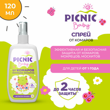 Средство от комаров Picnic Baby предназначено для деликатной защиты нежной кожи детей от нападения кровососущих насекомых (комаров, москитов, мокрецов). Разрешено к применению с самого раннего возраста (от 1 года). В составе спрея для детей Picnic - самый безопасный репеллент IR 3535, который можно использовать для защиты от комаров детей от 1 года. Бережная формула средства создана на основе репеллента нового поколения и не вызывает раздражения нежной детской кожи. Эффективное средство от комаров не содержит спирта, на водной основе. Время защиты при нанесении на кожу средства от укусов комаров до 2 часов, а на одежду до 5 суток. Проверено дерматологами.