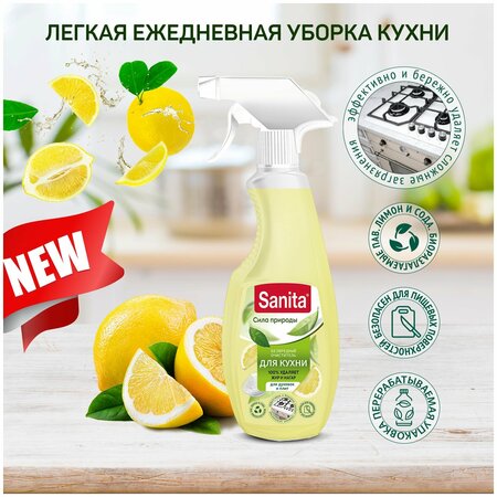 Чистящее средство для кухни Санита жидкость антижир 500 мл. Назначение. Средство предназначено для очищения плит, стеклокерамических плит, кухонной бытовой техники, микроволновых печей, керамических плит, вытяжек, духовых шкафов. Быстро и эффективно удалит жирные пятна, налет, сложные загрязнения. Способ применения. Использовать средство только на охлажденной поверхности, не использовать абразивные губки. Распылить средство на загрязненную поверхность. Выдержать 5–7 минут, протереть тряпкой или губкой. При необходимости обработку повторить. Не использовать для чистки окрашенных, полированных и лакированных поверхностей, а также изделий из нержавеющей стали и алюминия. Меры предосторожности. Осторожно! При попадании в глаза вызывает раздражение! При попадании в глаза — промыть большим количеством воды. При необходимости обратиться к врачу! Условия хранения. Хранить в недоступных для детей местах, отдельно от пищевых продуктов. Рекомендуется использовать резиновые перчатки. Не смешивать с другими средствами. Состав.5%–15% растворитель, <5% нпав, <5%: апав, d-лимонен, соль эдта, ароматизирующий компонент. Условия хранения Хранить в сухом прохладном месте. Предохранять от попадания прямых солнечных лучей. Срок годности.24 месяца.
