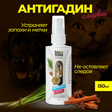 Средство для быстрой коррекции поведения питомцев: собак и кошек, щенков и котят. Эффективно отпугивает животных от тех или иных мест, предотвращая повторное стремление царапать, грызть, метить или справлять нужду. Разработано на основе активированных кислородных соединений, функциональных добавок и эфирных масел. Подходит для любых поверхностей, не оставляя следов после высыхания. Применение. Перед использованием средства «Антигадин Сладкий» необходимо обработать (убрать, помыть) место применения чистящим средством. Для этого идеально подходит средство Bioneat«Уход за животными», «Собаки» или «Кошки». После обработки и полного высыхания следует применить средство «Антигадин Сладкий». Распылите средство и оставьте до полного высыхания. В зависимости от поверхности средство следует применять каждый день пока питомец не перестанет шкодить в неположенном месте. Объем: 150 мл