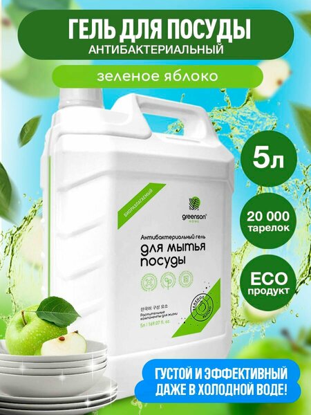 Концентрированный гель для посуды Зеленое Яблоко 5 литров с антибактериальным эффектом Greenson – это экологичное, безопасное и эффективное средство для мытья всех видов посуды (в том числе детской), кухонного инвентаря и детских игрушек от любых видов загрязнений, а так же подходит для мытья овощей и фруктов. Изготавливается по корейским технологиям. Мягкие биоразлагаемые тензиды из растительного масла обеспечивают хорошее пенообразование и эффективно удаляют жир и запахи даже в холодной воде, не вызывая раздражения кожи рук. Гипоаллергенный состав жидкости позволяет использовать его для мытья детской посуды и игрушек. Биоразлагаемые компоненты не вредят микрофлоре септических установок. У Гринсон биоразлагаемые, безопасные и эффективные эко продукты на уровне лидеров корейского рынка бытовой химии. Чтобы эко продукты GREENSON были эффективнее, мы привозим качественные компоненты из Кореи и используем самое современное европейское оборудование. А чтобы они были доступнее, производим их в России. Не содержит: агрессивные ПАВ, PEG, хлоросодержащие компоненты, минеральные масла, силиконы, производные нефтепродуктов, искусственные ароматизаторы и красители. Инструкция по применению : Нанести средство на очищаемую поверхность, вымыть поверхность, ополоснуть водой. При приготовлении моющего раствора используйте 5 мл средства на 5 л воды. Условия хранения: от +5°С до +25°С в недоступном для детей и защищенном от прямых солнечных лучей месте. Под воздействием солнечных лучей возможно изменение цвета средства, не влияющее на его качество и свойства. Средство замерзает, после размораживания и перемешивания сохраняет свои свойства. Предназначен для переливания во флакон с дозатором.
