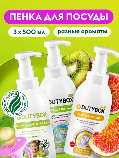 Эко-пенка для мытья посуды 3 по 500 мл. В набор входит средство для мытья детской посуды без отдушек и красителей. Средство с фруктовым ароматом, а также пенка с запахом инжир-мелисса. Многоразовые бутылочки с готовыми средствами для мытья посуды, подходят для перезаполнения концентратами Dutybox. Пенка безопасна для ухода за детской и взрослой посудой, для тарелок, бутылочек, сосок и игрушек. Моющее средство подходит для людей с чувствительной кожей, не вызывает раздражения и сухости, увлажняет и заботится о коже. Гипоаллергенное, для детей с первых дней жизни, для малышей и новорожденных 0+. Средство для мытья посуды и фруктов безопасно и эффективно даже в холодной воде, отлично нейтрализует неприятные запахи и удаляет жир (антижир) и полностью смывается водой, проще чем гель, справляется с любыми видами загрязнений. Безопасно для использования в домах с септическими установками. Не содержит фосфатов и агрессивных красителей, глицерин, безопасно для септика в частных домах или на даче. Густая пена получается сразу и обеспечивает экономичный расход средства.