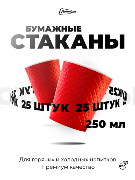 Набор двухслойных рифленых бумажных стаканов 250 мл. В наборе 25 стаканов с вафельной текстурой. Полный объем (до края) - 280 мл. Диаметр горла - 80 мм, диаметр дна - 57 мм, высота - 88 мм. Для стаканчиков подходят крышки с диаметром 80 мм. Стаканчики произведены из высококачественного европейского картона, долго держат тепло, не нагреваются снаружи, отлично сохраняют форму даже под действием высоких температур. Стакан приятно держать в руках, он не выскальзывает из рук. Двухслойные бумажные стаканы являются настоящими термосами из бумаги. Благодаря двум слоям и воздушной прослойке между ними температура жидкости сохраняется еще дольше. Бумажные стаканчики Formacia подходят для любых видов напитков: кофе, чая, воды, соков и т. д. Экологичный картон не влияет на вкус напитка, он абсолютно безопасен для здоровья. При производстве не используется клей, стакан спаивается с помощью ультразвука, что гарантирует полную герметичность. На внешнюю сторону стакана можно наносить рисунки или надписи. Одноразовые бумажные стаканы идеально подходят как для домашнего, так и для коммерческого использования.