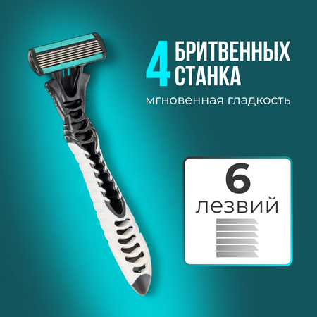 Набор безопасных бритв, 4 станка, головка подвижная с 6 лезвиями и увлажняющими полосками алое вера и витамин Е