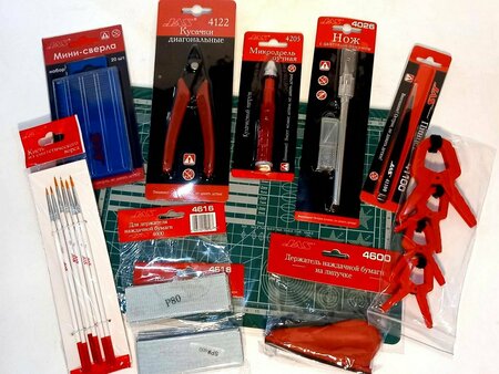 Стартовый набор ручного инструмента для моделиста включает самое необходимое для начала работы. Со временем в домашней мастерской появятся, возможно, другие разнообразные инструменты и приспособления для разных задач. Но этот набор позволит приступить к работе сразу. Для каждого этапа есть несколько удобных и качественных инструментов: для резки: Удобные бокорезы для пластика с узкими губками для работы с мелкими деталями и противоскользящими рукоятками Трёхслойный коврик для резки с разметкой (А4, 22х30 см) Удобный модельный нож с тремя сменными лезвиями для обработки поверхностей: "Шкурник"-держатель наждачной бумаги на липучке (30x90 мм) + для него сменная шкурка на липучке (14 штук) различной зернистости от 80 до 1500. для фиксации деталей: 3 маленьких зажима (детали до 25 мм) и 1 средний (детали до 38 мм). Пинцет прямой 120 мм. для сверления: Микродрель ("сверлилка") ручная, с кулачковым патроном JAS4205 и мини-сверла к ней, диаметр от 0,3 до 1,6 мм, 20 шт, HSS 4342 для покраски и нанесения эффектов: Набор плоских кистей различных размеров из синтетического волоса, 6 шт. (№ 0000, 000, 00, 0, 1, 2)