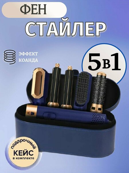 Стайлер 5-в-1 с кейсом, плойкой, феном и насадками для объема и укладки волос, синий
