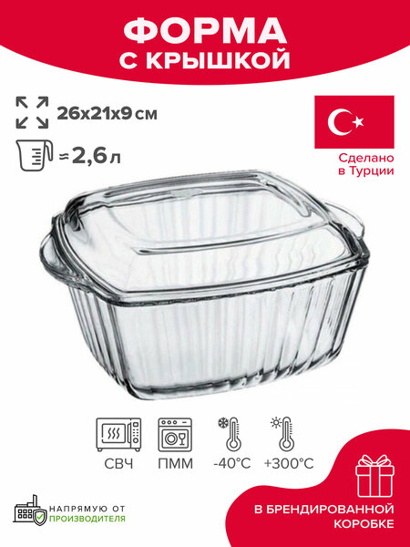 Форма для выпечки и запекания квадратная из стекла с крышкой, 2600 мл