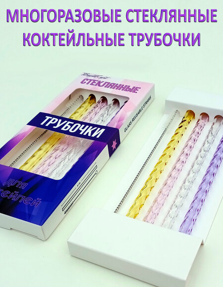 Стильные Новогодние фигурные стеклянные цветные трубочки для питья коктейлей и напитков! Представлен эксклюзивный неповторимый дизайн трубочек с "алмазными" гранями. В коктейльном наборе: 4 прямые многоразовые стеклянные трубочки желтого розового фиолетового и прозрачного цветов и 1 ёршик. Длина трубочек 20 см, диаметр 8 мм. Толщина стекла 1,5 мм. Ёршик Ø 10 мм. Идеально подходят для обычных бокалов и высоких стаканов, а также бутылок банок и шейкеров. Из них можно пить все виды горячих и холодных напитков: молочный протеиновый коктейль, смузи, алкогольный и безалкогольный напиток, сладкий сироп, свежевыжатый сок, ликер, лимонад, освежающий мохито, игристое шампанское, колу со льдом, воду или горячий кофе и чай. Трубочки изготовлены из высококачественного термостойкого боросиликатного стекла, способного выдерживать резкие экстремальные перепады температур от -20°C до +150°C без повреждения. Что делает их прочными, долговечными и экологичными, в отличие от пластиковых или бумажных трубочек. Боросиликатное стекло широко используется в производстве термостойкой премиальной кухонной посуды и аксессуаров, бокалов для напитков и лабораторного оборудования. Является нетоксичным, химически нейтральным и экологически чистым материалом. Не впитывает запахи, не изменяет вкус напитка и не теряет цвет. Не загрязняет окружающую среду, можно перерабатывать. Трубочки легко моются, подходят для посудомоечной машины. Края трубочек скруглены для безопасного применения. Данный набор стеклянных трубочек может стать отличным сувениром или подарком к любому празднику: 8 Марта, 14 февраля, День влюбленных, Новый год, Рождество, День рождения или просто в знак внимания к Вашим близким. Соломинки идеально подойдут для любого события - будь то пикник на природе или даче, веселая молодежная вечеринка в клубе, баре и ресторане, девичник или просто уютный вечер дома при свечах. С их помощью Вы сможете насладиться ароматными коктейлями в любое время, а встреча Нового года будет яркой!