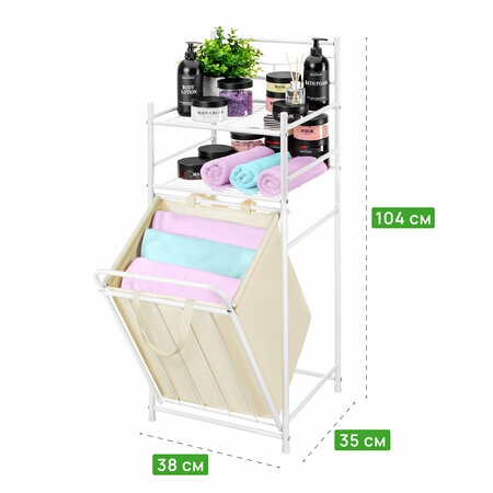 38*35*104 см с 2-мя полками и корзиной для белья, расстояние между полками 16,5 см, объём корзины для белья 43 л 32*30*45 см