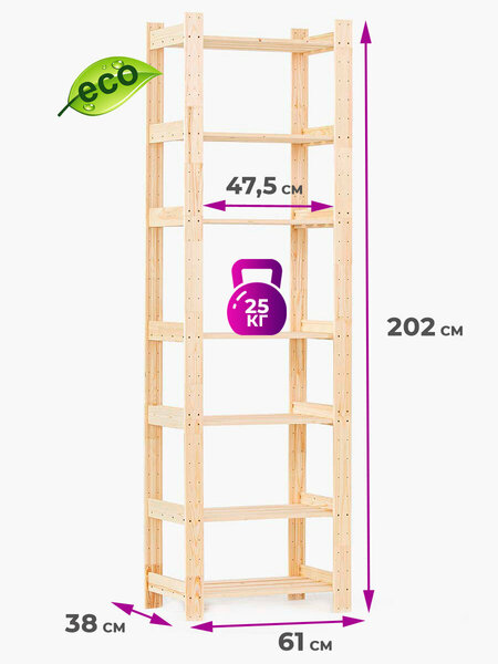 Стеллаж деревянный высокий Lesovik - функциональное и стильное решение для организации пространства в вашем доме. Изготовленный из массива сосны, этот стеллаж не только прочен и надежен, но и обладает приятным ароматом, который способствует укреплению здоровья. Семь полок позволяют разместить на нем большое количество вещей. Максимальная нагрузка на каждую полку составляет 25 кг, что делает его подходящим для хранения тяжелых предметов, таких как банки с соленьями или книги. Благодаря своей конструкции, стеллаж может быть собран в три компактных стеллажа высотой 67 см. Это позволяет легко перемещать полки в зависимости от ваших потребностей и адаптировать стеллаж под любое пространство. Стеллаж Lesovik может быть использован в различных помещениях вашего дома. Он подойдет для хранения растений и цветов в гостиной или детской комнате, для размещения книг в кабинете или для хранения игрушек в детской. Для сборки стеллажа вам понадобятся только отвертка или шуруповерт. В комплекте идут соединительные саморезы, что облегчает процесс сборки. Для продления срока службы стеллажа рекомендуется использовать лак или воск для защиты дерева. Габариты стеллажа составляют 202 см в высоту, 61 см в ширину и 38 см в глубину. Цвет товара - бежевый. Выбирая стеллаж деревянный высокий Lesovik, вы получаете не только функциональное и стильное решение для организации пространства, но и качественный продукт, который прослужит вам долгие годы.