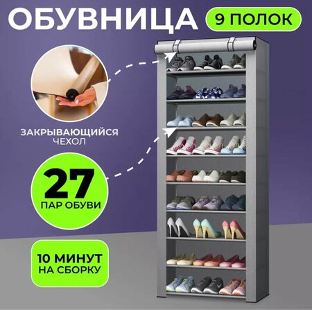 Обувница - это универсальный мебельный элемент для организации порядка и хранения вещей. Она оборудована 9 уровнями полок для обуви и одежды. Еë элегантный дизайн и серый цвет позволят легко вписаться в любое помещение. Обувница поможет вам создать систему хранения, которая будет сочетать в себе функциональность и стиль. Она имеет прочный металлический каркас и усиленные пластиковые соединители, водонепроницаемый чехол на молнии для защиты ваших вещей от пыли и влаги.