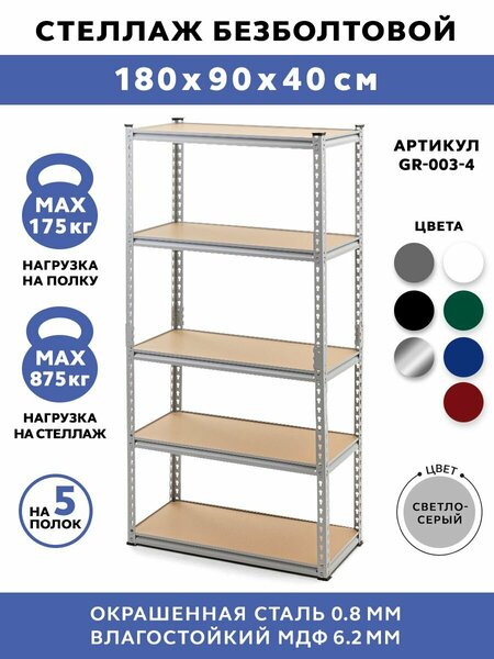 Стеллажи металлические безболтовые Gastrorag GR-003-4 размером 180х90х40 см представляют собой универсальную 5-ярусную систему хранения вещей для гаража и сада, кладовой, кладовки и подсобки, балкона и лоджии. Это многофункциональная мебель в стиле лофт для квартиры, дома, дачи и офиса. Они также подойдут в качестве больших торговых или складских стеллажей для магазина. Стеллаж лофт можно использовать в качестве перегородки для зонирования пространства гостиной, спальни и гардеробной. В гараже и мастерской он подойдет в качестве полки для хранения инструментов или металлического органайзера. Дома и на даче используйте его как подставку для обуви в прихожую, открытый шкаф для одежды, книг и игрушек, кухонного стеллажа для посуды или полки для микроволновки на кухню. В садоводстве он пригодится в качестве стеллажа под рассады, этажерки для комнатных цветов и растений. Ему найдется применение и в качестве офисной мебели для хранения папок с документами и размещения оргтехники. Железный окрашенный стеллаж поставляется в разобранном виде. Стеллаж трансформер укомплектован стойками, которые состоят из двух частей. Благодаря этому вы сможете собрать как один стеллаж высотой 180 см с 5 полками, так и 2 стеллажа высотой 90 см с 2 и 3 полками. Стойки и рамы полок изготовлены из прочной стали толщиной 0.8 мм с порошково-полимерным покрытием, полки - из влагостойкого МДФ толщиной 6.2 мм. Влагостойкий МДФ может в течение длительного времени выдерживать повышенную влажность воздуха, поэтому стеллаж можно использовать и для ванной комнаты, однако прямого попадания жидкости на его поверхность следует избегать. Стеллаж имеет практичное безболтовое соединение (тип зацепа - клепка) и легко собирается при помощи деревянной или резиновой киянки. Пластиковые подпятники надежно предохраняют пол от повреждений. Жесткости конструкции и толщины металла и МДФ достаточно для того, чтобы обеспечить максимальную распределенную нагрузку на полку - 175 кг, на весь стеллаж - 875 кг. Длина полочки 90 см, ширина 40 см. Высота полок регулируется с шагом 30 мм. Высота полок регулируется с шагом 30 мм. В целях обеспечения устойчивости рекомендуется ставить стеллаж вплотную к стене и дополнительно крепить его к стене.