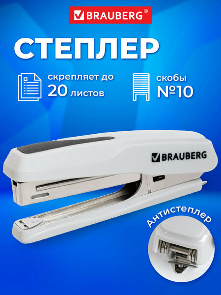 Степлер №10 BRAUBERG "Extra" — это идеальный выбор для канцелярии и офиса, способный легко справляться с большим объемом документов. Этот канцелярский степлер с металлическим механизмом может скрепить до 20 листов, обеспечивая надежное соединение. Благодаря компактным размерам он не займет много места на рабочем столе, а стильный серый цвет прекрасно впишется в любой интерьер. Степлер также функционирует как антистеплер, позволяя аккуратно разжимать скобы, не повреждая материалы или кончики пальцев. Глубина закладки бумаги составляет 55 мм, а соответствующие скобы №10 делают этот прибор универсальным инструментом для работы. Выбирая этот степлер, вы получаете надежный и качественный аксессуар, который станет незаменимым в вашей канцелярии и офисе. Не упустите возможность улучшить свою работу с помощью этого функционального и стильного прибора! Откройте для себя наш многофункциональный канцелярский степлер – идеальный выбор как для офиса, так и для школьников. Этот компактный степлер предлагает удобство и эффективность, необходимые для повседневных задач, будь то сшивание документов в офисе или подготовка учебных материалов для школы. Мини степлер прост в использовании и легко помещается в сумку или портфель. Благодаря компактному дизайну, маленький степлер можно хранить в школьном пенале или офисном ящике. Также у нас представлены большие степлеры, обладающие повышенной мощностью и емкостью для сшивания большого количества листов. Эти степлеры оснащены поворотным механизмом, который позволяет менять направление скоб для разных форматов сшивания. Наша продукция предполагает надежное и безопасное использование как в учебных, так и в рабочих условиях. Это делает наши степперы идеальным выбором для учеников, студентов и офисных работников, которые ищут надежные и удобные канцелярские принадлежности. • Подходящие скобы: № 10. • Максимальное количество скрепляемых листов: 20. • Наличие антистеплера: да. • Вместимость скоб: 100 шт. • Серия: Extra. • Глубина закладки бумаги: 55 мм. • Виды сшивания степлером: закрытый. • Цвет корпуса: серый. • Материал корпуса: пластик. • Высота корпуса: 38 мм. • Длина корпуса: 97 мм. • Ширина корпуса: 22 мм. • Упаковка: картонная коробка. • Артикул производителя: 229083.