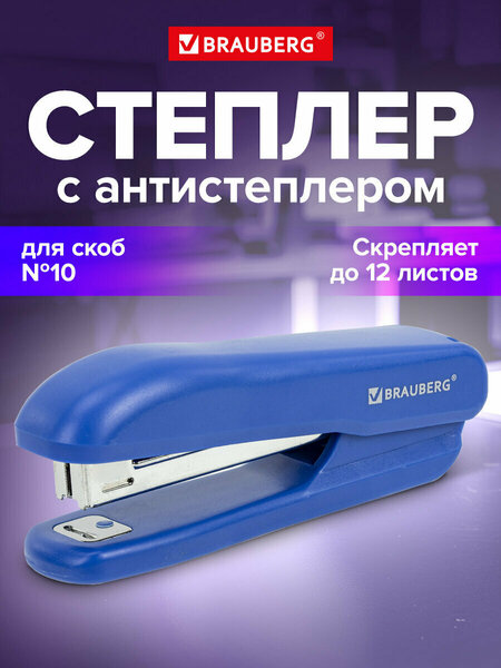 Степлер №10 BRAUBERG "SX-19" — ваш надежный помощник в мире канцелярии для офиса. Этот степлер канцелярский из прочного пластика и с металлическим механизмом способен скрепить до 12 листов, что делает его идеальным для работы с большим объемом документов. Стандартные скобы №10 гарантируют стабильность и надежность при использовании. Благодаря глубине закладки бумаги в 50 мм, вы сможете эффективно организовать свои офисные принадлежности. Уникальная функция антистеплера позволяет вам с легкостью разжимать скобы без повреждения материалов и без лишних усилий. Компактные размеры прибора делают его идеальным для рабочего стола, а классический дизайн впишется в любой офисный интерьер. Степлер BRAUBERG "SX-19" — это не просто мини степлер, это функциональное решение для всех, кто ценит качество и удобство в канцтоварах для офиса. Сделайте рабочий процесс более комфортным с этим незаменимым аксессуаром! Нас покупают по запросам: степлер, степлеры канцелярские, мини степлер, степлер маленький, степлеры канцелярские большой, степлер канцелярские товары, степлер со скобами • Подходящие скобы: № 10. • Максимальное количество скрепляемых листов: 12. • Наличие антистеплера: да. • Вместимость скоб: 100 шт. • Серия: SX-19. • Глубина закладки бумаги: 50 мм. • Виды сшивания степлером: закрытый, прямой. • Цвет корпуса: синий. • Материал корпуса: пластик. • Высота корпуса: 39 мм. • Длина корпуса: 100 мм. • Ширина корпуса: 26 мм. • Упаковка: картонная коробка. • Артикул производителя: 228588.