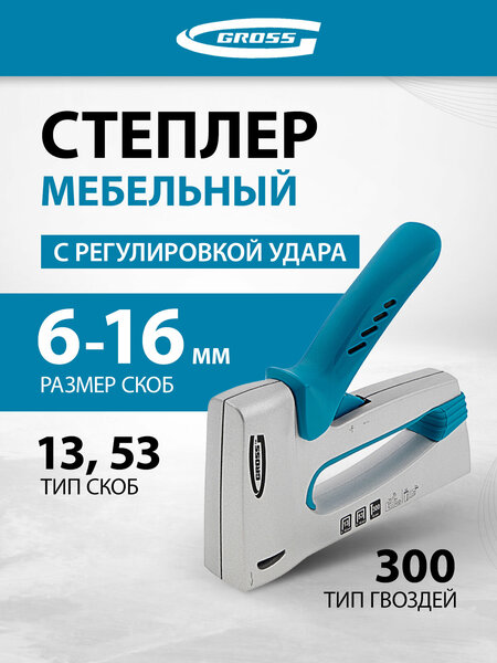 Мебельный степлер Gross 41002 в алюминиевом корпусе, с функцией регулировки силы удара, совместим со скобами типа 13 и 53 размером 6-16 мм и гвоздями типа 300 размером 16 мм. Инструмент используют для фиксации на деревянном основании оргалита, фанеры, ДВП, ДСП, пленки, утеплителя и других листовых материалов. Инструмент будет полезен при сборке и обшивке мебели, укладке ковровых покрытий и изоляционных материалов, выполнении багетных работ. Подходит для профессионального применения.