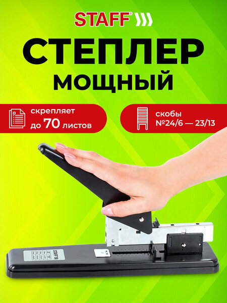 Мощный степлер STAFF "Manager" идеально подходит для канцелярии и офиса, обеспечивая надежное скрепление до 70 листов бумаги. Этот степлер канцелярский с металлическим корпусом и рабочим механизмом в черном цвете станет отличным дополнением к офисным принадлежностям. Благодаря регулируемой глубине закладки бумаги до 72 мм и фронтальной загрузке скоб, использование этого степлера становится максимально удобным. Подходит для различных типов скоб, включая № 24/6, 26/6, 23/8, 24/8, 23/10 и 23/13, что делает его универсальным выбором для любого офиса. Этот мини степлер с закрытым видом сшивания обеспечит аккуратный и надежный результат, необходимый для вашей канцелярии. Незаменимый прибор среди канцтоваров для офиса, степлер канцелярский со скобами STAFF "Manager" станет вашим надежным помощником в повседневной работе. • Максимальное количество скрепляемых листов: 70. • Серия: Manager. • Подходящие скобы: № 23/10, № 23/13, № 23/8, 24/8, № 24/6, 26/6. • Регулируемая глубина сшивания: да. • Глубина закладки бумаги: 72 мм. • Наличие линейки: да. • Виды сшивания степлером: закрытый. • Загрузка скоб: задняя. • Основной цвет корпуса: черный. • Дополнительный цвет корпуса: нет. • Материал корпуса: металл. • Высота корпуса: 165 мм. • Длина корпуса: 280 мм. • Ширина корпуса: 89 мм. • Упаковка: картонная коробка. • Артикул производителя: 227663.