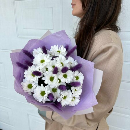 Нежный букет из кустовой ромашковой хризантемы и веточек стабилизированной лаванды создаст непременно весеннее и романтическое настроение, легкий аромат цветов придаст ощущение свежести и легкости. Такой букет будет прекрасным подарком на день рождения, юбилей, рождение ребенка и просто подарок без повода в качестве комплимента. Состав: Хризантема кустовая- 3 шт, лагурус- 10шт, дизайнерская упаковка. Доставляется букет на аквапаке с водой и в транспортировочной коробке, что гарантирует бережную доставку самых свежих цветов с незабываемым ароматом. Уход за цветами. Чтобы букет простоял как можно дольше, важно соблюдать некоторые базовые правила по уходу. Хранить цветы следует в прохладном месте. На букет не должны попадать прямые солнечные лучи. Держать букет следует в емкости со свежей водой. Периодически следует менять воду. Вода должна быть прохладной. Для хранения в вазе нужно подрезать стебли под углом, а также удалить нижние листья, которые находятся в воде. Соблюдая эти не сложные правила, цветы будут радовать Вас долго своей красотой! Внимание! Может отличаться оттенок цветов - это зависит от плантации, на которой он выращен, а также оттенок упаковки. В качестве приятного бонуса - мы дарим бесплатную фирменную открытку. При оформлении заказа оставьте комментарий с текстом для открытки и мы ее вложим в заказ! Дорогие клиенты, переходите в наш магазин FLOROOM1 и выбирайте дополнения к подаркам. У нас есть воздушные шарики, открытки, мягкие игрушки, товары для интерьера, свечи, сладости ручной работы, фруктовые корзины и много всего интересного! Будем рады знакомству!
