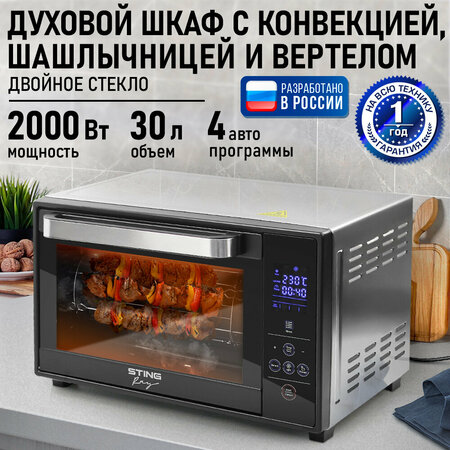 2000 Вт,30л, Сенсорное управление, Цифровой дисплей, Корпус из нерж. стали, Камера с антиприг. покр, Двойное стекло, конвекция, подсветка, 8 авто режимов (в т. ч. хлеб, разморозка и пр.)+ручные настройки, Темп: 25-230°C, таймер 120мин, Звуковой сигнал, Отложен. Данная модель оснащена: • Большим цифровым дисплеем и сенсорным управлением; • 8 автоматическими программами, а также возможностью пользовательских настроек температуры и времени работы; • Режимом конвекции; верхним и нижним нагревами, работающими как по отдельности, так и вместе; • Широким набором аксессуаров: шашлычница, вертел и ручка для вертела, круглая форма для выпечки, противень, решетка, ручка для извлечения противня и решетки; • Таймером со звуковым сигналом и автоматическим выключением прибора; • Функцией отложенного старта программы приготовления. Всё это сделает процесс приготовления горячей пищи удобным и быстрым! • Режим конвекции избавляет от необходимости перемещения блюда и противня во время приготовления, так как обеспечивает постоянную циркуляцию горячего воздуха по всей внутренней камере, за счет чего достигается одинаковая температура нагрева блюда со всех сторон, что позволяет пище запекаться и покрываться румяной корочкой равномерно по всей поверхности. • Шашлычница и вертел с электроприводом обеспечат особенно аппетитное запекание целой курицы, больших кусков мяса, рыбы и овощей-гриль. За счет автоматического плавного вращения блюда запекаются равномерно со всех сторон, приобретая красивую хрустящую корочку и особый вкус. Мясо получается очень сочным и при этом менее жирным, а потому полезным, так как при приготовлении на вертеле жир стекает, а сок «запечатывается» и сохраняется внутри блюда. Электрический духовой шкаф, мини печь, электродуховка