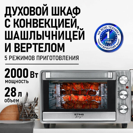 STINGRAY ST-EO128C - это мини-печь, которая сочетает в себе функциональность и стиль. Она выполнена в стальном корпусе и имеет стальную панель управления, что придает ей современный и элегантный вид. Мини-печь оснащена 28-литровой камерой, что позволяет готовить большие порции блюд. Мощность печи составляет 2000 Вт, что обеспечивает быстрый нагрев и равномерное распределение тепла внутри камеры. Особенностью данной модели является наличие конвекции, благодаря которой воздух равномерно распределяется по всей камере, обеспечивая быстрое и равномерное приготовление пищи. Мини-печь имеет 5 режимов работы, включая конвекцию, что позволяет выбрать оптимальный режим для приготовления различных блюд. Температурный диапазон составляет от 100 до 250 градусов Цельсия, что позволяет готовить как горячие, так и холодные блюда. Управление мини-печью осуществляется механически, что делает ее простой и удобной в использовании. Таймер на 60 минут позволяет контролировать процесс приготовления, а внутренняя подсветка камеры облегчает контроль за процессом. В комплекте с мини-печью идут шашлычница, вертел, эмалированный противень, решетка и поддон для сбора крошек. Это позволяет использовать печь не только для приготовления пищи, но и для приготовления шашлыка на открытом воздухе. STINGRAY ST-EO128C - это надежный и функциональный помощник на вашей кухне, который станет незаменимым помощником в приготовлении разнообразных блюд.