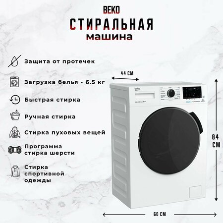 Белая стиральная машина с загрузкой барабана 6.5 кг и 15 программами для разных типов ткани. Дополнительные режимы стирки позволяют добавлять замачивание и полоскание и легко удалять шерсть животных с вашей одежды. Стиральная машина оснащена инверторным мотором ProSmart, который работает тихо и экономично потребляет электричество, технологией обработки паром SteamCure, электронным контролем дисбаланса и контролем пенообразования. Стиральная машина обладает электронным управлением с телефона по Bluetooth - подключение HomeWhiz. 2 кг чистых вещей за 14 минут: Экспресс-программа за 14 минут позволяет постирать до 2 кг белья. Защита водонепроницаемых тканей: Программа «Спорт/Мембрана» медленно вращает барабан, предотвращая трение одежды о его стенки, что позволяет сохранить водоотталкивающие и воздухопроницаемые свойства одежды. Технология Pet Hair Removal: Функция удаления шерсти эффективно удаляет с ткани шерсть домашних питомцев за счет дополнительных алгоритмов подачи воды и вращения барабана. *Цифровой дисплей: есть *Материал барабана: нержавеющая сталь *Объем барабана: 39л *Легко открывающийся люк *Автоматический контроль уровня воды *Отложенный старт на 0-19 ч. *Индикация хода выполнения программы *Плавная регулировка скорости отжима *Защита от детей, Электронный контроль дисбаланса *Дополнительные функции: Замачивание, Fast+, Экстра полоскание. *Класс А/А/С *Материал барабана: нержавеющая сталь *Размеры (ВхШхГ), см: 84х60х44 *Вес: 56кг *Цвет: белый, цвет люка: антрацит + итальянское стекло *Увеличенный диаметр люка: 34см Страна производства: Россия